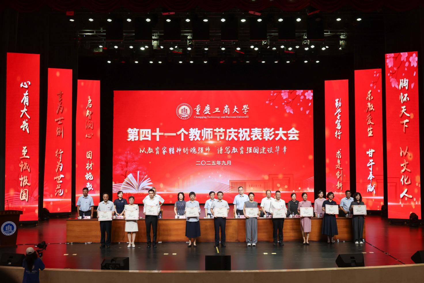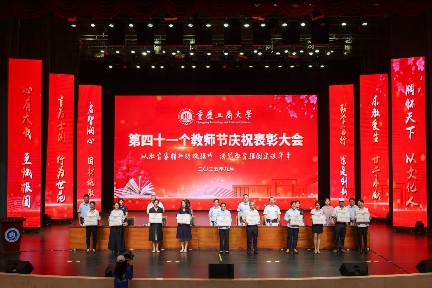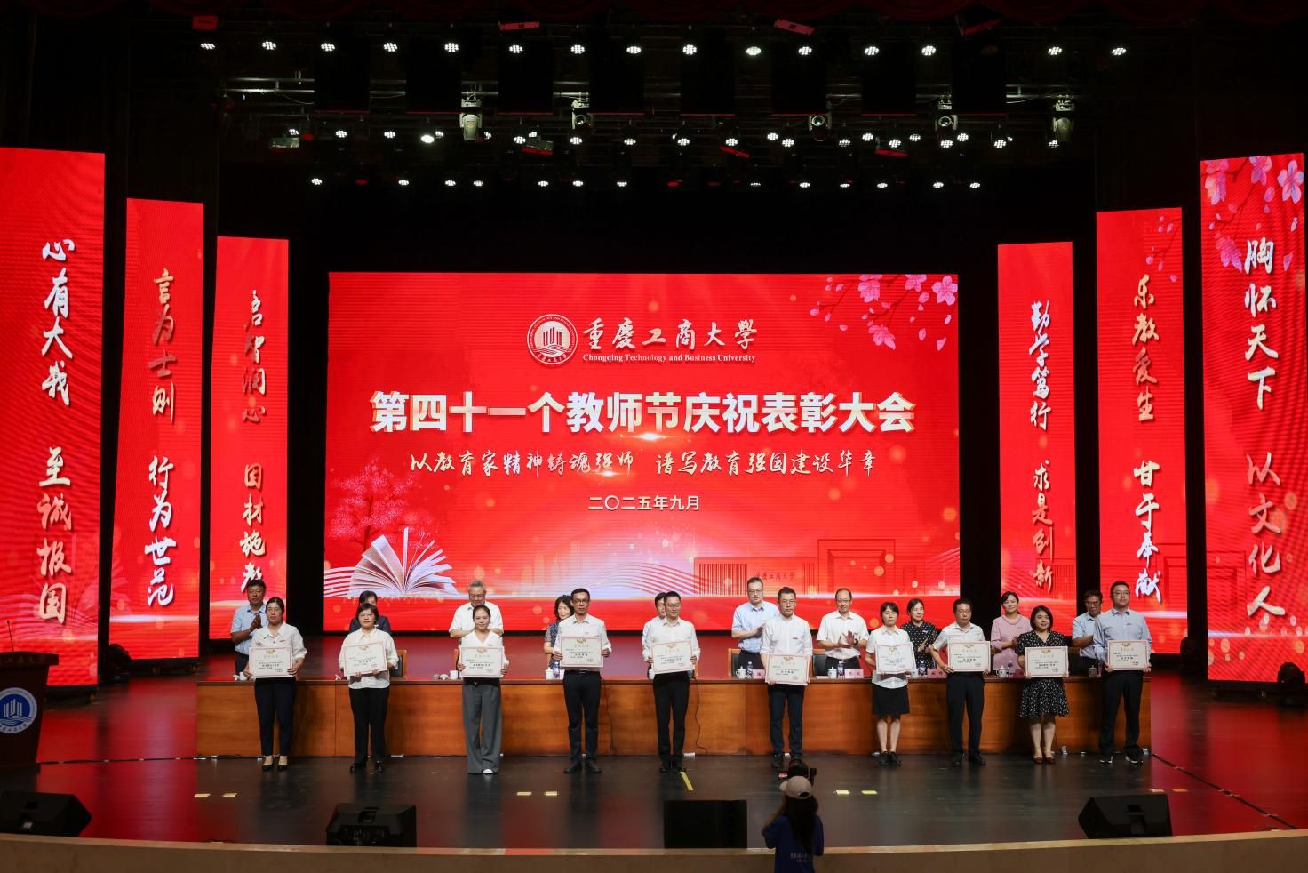当前位置: 首页 >> 工作动态 >> 正文 授业传薪承远志 滋兰树蕙谱华章 学校举行第四十一个教师节庆祝表彰大会 时间:2025年09月11日 11:03 作者:邓艺 蒋梦宇 9月10日下午,学校在太阳集团tyc122cc剧场举行教师节庆祝表彰大会。学校党委书记曾维伦出席会议并讲话。校长温涛主持会议。 曾维伦代表学校向全体教职员工致以诚挚节日的问候,向受到表彰的先进个人和集体表示热烈的祝贺,向光荣退休和从事教育工作满三十年的教职工致以崇高的敬意,向新入职的教职员工表示热烈的欢迎。 曾维伦指出,过去一年,学校深入学习贯彻习近平总书记关于教育的重要论述和全国教育大会精神,实施教育家精神铸魂强师行动,教师队伍建设取得良好成效。全体教职员工大力弘扬教育家精神,在各自岗位上勇担重任、砥砺奋进、默默奉献,交出了一份亮丽的答卷。学校在办学层次、学科专业建设、科研创新、茶园校区建设等多个领域实现重大进展;不仅在优势领域继续保持前列,还在人才培养、服务社会等方面取得了新成效。这些成绩的取得,离不开每一位教职员工的辛勤付出,彰显了重工商大人为党育人、为国育才的使命与高度,挺膺担当、奋勇争先的拼搏与力度,甘为人梯、润泽学生的仁爱与温度。 曾维伦强调,以教育家精神铸魂强师,谱写教育强国建设华章,迫切需要加快建设一支政治素质过硬、业务能力精湛、育人水平高超的高素质专业化教师队伍。一要加强教师队伍思想政治建设,坚持不懈用习近平新时代中国特色社会主义思想武装头脑。要胸怀“国之大者”,立足本职岗位,追求“躬耕教坛,强国有我”的价值实现,忠诚于党的教育事业。二要强化“第一标准”,涵养高尚师德师风。自觉践行教育家精神,自觉加强师德修养,做到模范遵纪守法,模范遵守新时代教师职业行为准则。三要不断提升教师教书育人本领。牢固树立终身学习的意识,深入挖掘大学问、充盈大学识,涵养精神修养、文化气度和育人情怀。四要以服务“国之所需”作为最高追求。全力推动具有我校特色辨识度的“商工融合、多科协同”学科专业生态体系建设行稳致远,把教育家精神蕴含的“求是创新”意识、“至诚报国”追求转化为教育报国、科技报国的实际行动。希望广大教师立足岗位,忠诚履职,以卓越育人成效、高质量创新成果为教育强国、科技强国建设贡献力量。 曾维伦号召,全体教职工要深刻把握教育家精神的丰富内涵和实践要求,将其融入血脉、铸入灵魂、化为行动,以“躬耕教坛、强国有我”的志向和抱负,潜心教书育人,勇攀学术高峰,努力成长为党和人民可以信任和依靠的“大先生”。 温涛在主持中表示,过去一年里学校全面贯彻落实党的二十大和二十届二中、三中全会精神,深入学习贯彻习近平总书记关于教育的重要论述和全国教育大会精神,全体教职员工坚守立德树人初心,牢记“为党育人、为国育才”使命,同心同德,奋力拼搏,谱写了学校教育事业发展的新篇章。希望教师们在教学中深耕,在科研中突破,在服务中创新,共同书写学校发展的新篇章;要继续以赤诚之心、奉献之心、仁爱之心投身教育事业,认真落实全国教育大会精神,以教育家精神铸魂强师,谱写教育强国建设华章。 大会为第四批重庆市学术技术带头人及后备人选、2025年巴渝学者计划人选颁发了证书;表彰了第三批师德先进个人,2024-2025学年优秀教师、优秀教育工作者,第五届重庆市高校教师教学创新大赛、第四届川渝青年教师风采大赛、太阳集团tyc122cc第六届教师教学奖获奖人员,2024-2025学年优秀辅导员、2023-2025学年标兵辅导员,并为满30年教龄的教师和从事学校工作满30年的教职工颁发纪念证书。 校领导为第四批重庆市学术技术带头人及后备人选、2025年巴渝学者计划人选颁发证书 校领导为第三批师德先进个人颁奖 校领导为2024-2025学年优秀教师、优秀教育工作者颁奖 校领导为第五届重庆市高校教师教学创新大赛、第四届川渝青年教师风采大赛、太阳集团tyc122cc第六届教师教学奖获奖人员颁奖 校领导为2024-2025学年优秀辅导员、2023-2025学年标兵辅导员颁奖 校领导为满30年教龄的教师和从事学校工作满30年的教职工颁发纪念证书 会上,曹策俊老师作为优秀青年教师代表发言。他从“初心、科研、教学、责任”四个方面分享自身感悟,表示将秉承教育家精神,以铸魂强师为己任,以潜心科研、扎根讲台为使命,在不断提升自身素养的道路上坚定前行,为学校学科专业长远发展和人才培养质量持续提升,为谱写教育强国建设的华章贡献更大的力量。 大会举行了新教师宣誓仪式,教师代表周婧云老师带领新教师代表庄严宣誓。 大会为退休教职工举行了荣休仪式。学生代表们手捧鲜花,感恩他们在普通却崇高的教育岗位上的勤恳付出与默默奉献。 人工智能学院2024级汪蕾同学作为学生代表发言,她谈到,将会牢记老师的教诲,秉持“厚德博学、求是创新”的校训,珍惜在校的每一寸时光,潜心钻研知识,锤炼品德修为,以老师们为榜样,努力成长为有理想、敢担当、能吃苦、肯奋斗的新时代青年,用优异的成绩回馈师恩,用青春的力量为国家建设、民族复兴添砖加瓦。 全体校领导,受表彰人员代表,全体中层干部和专职组织员,新老教师代表,教职工代表,学生代表出席会议。 上一条:校领导带队开展教师节前慰问活